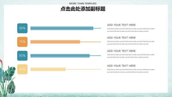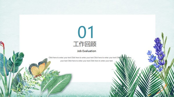 每月都要做个人工作总结的朋友可以来看看这组ppt模板,主打小清新的风格,从它的预览图片上就能看出来,绿叶、花朵、蝴蝶等元素能给人 带去扑面而来的清新自然感,给人留下良好的第一印象。该ppt模板是免费的哦,大家下载后打开就能直接便捷了,可自行添加内容。